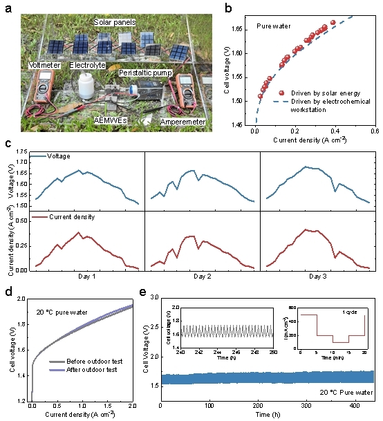 更值得注意的是,纯水供给下的GCB-AEMWE在0.50A cm⁻²下稳定运行1000小时,电压衰减率低至65μV h⁻¹,是目前报道的纯水AEMWE的最低值。该电解槽在波动太阳能供电条件下表现出优异的稳定性,展现出与可再生能源系统良好的兼容性。该研究通过膜电极界面结构创新,为实现高性能、长寿命的纯水供给阴离子交换膜电解槽制氢提供了新思路。