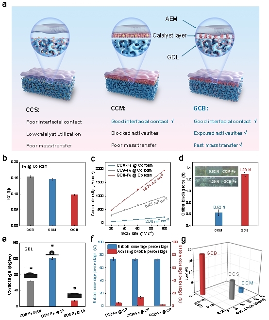 近日,清华大学深圳国际研究生院刘碧录教授团队开发了一种无离聚物、近零间隙的催化剂桥接膜电极(GCB-MEA),通过限域定向沉积策略构建了结构紧密、界面牢固的MEA结构。该GCB-MEA中的阴离子交换膜与气液扩散层通过催化剂层桥连,使得膜电极界面接触电阻小、活性位点暴露多、传质动力学快及界面结合力强。