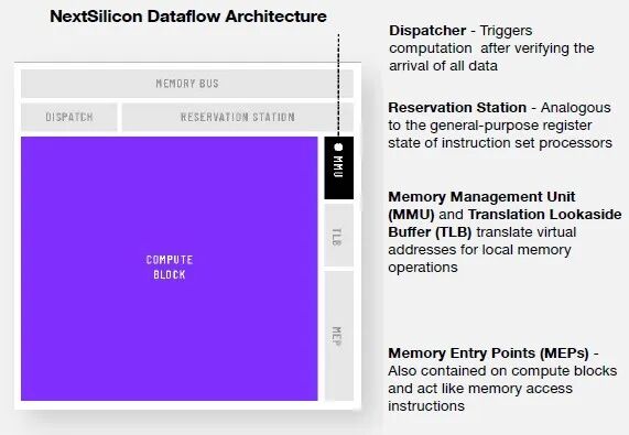 如上图右侧所示,这个主逻辑单元连接到一条内存总线,该总线上有一个保留站,用于在 ALU 调用数据之前临时存储数据。(NextSilicon 已获得这种保留站、调度器和数据流计算块组合的专利。)与常规 CPU 一样,Maverick ICA 也使用内存管理单元和表后备缓冲区,但这些单元的使用频率很低,并且仅在 ALU 调用特定数据时才会使用。它不进行推测或预测,只进行数据提取。