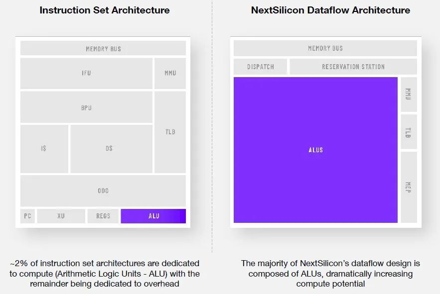 总结而言,NextSilicon 的数据流架构建立在图形结构之上。数据流处理器并非像冯·诺依曼那样逐条处理指令,而是由一系列计算单元(称为 ALU)组成,这些单元以图形结构互连。每个 ALU 处理特定类型的函数,例如乘法或逻辑运算。当输入数据到达时,计算会自动触发,结果将流向图形中的下一个单元。与串行数据处理相比,这种新方法具有很大的优势,因为芯片不再需要处理数据提取、解码或调度,这些是消耗计算周期的开销任务。