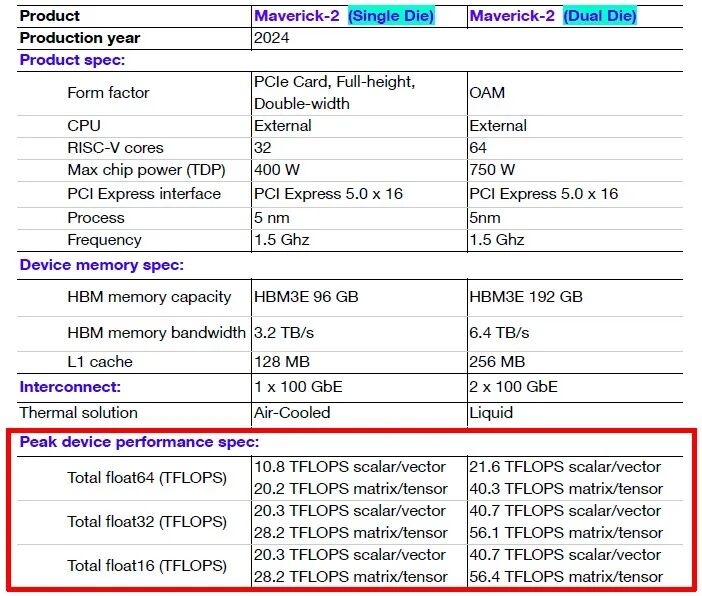 据介绍,Maverick-2 提供单芯片和双芯片两种配置。单芯片 Maverick-2 拥有 32 个 RISC-V 核心,采用台积电 5nm 纳米工艺制造,主频为 1.5GHz。该卡支持 PCIe Gen5x16,配备 96GB HBM3E 内存,内存带宽高达每秒 3.2TB。它拥有 128MB 的一级缓存,配备 100GbE 网卡,热设计功耗 (TDP) 为 400W,并采用风冷散热。双芯片 Maverick-2 则有效地将所有这些功能翻倍,但它需要接入 OAM(OCP 加速器模块)总线,配备两个 100GbE 网卡,支持风冷或液冷散热,热设计功耗为 750W。