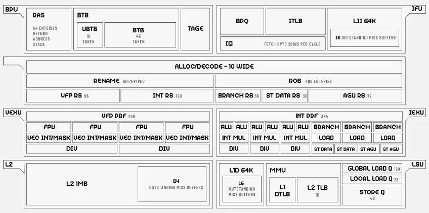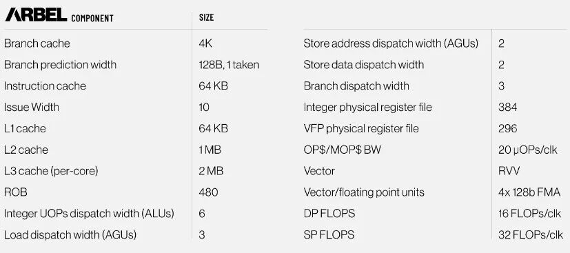 1、大规模指令流水线具有 10 宽的发射宽度和 480 条目的重新排序缓冲区,使 Arbel 能够一次发现更多问题并最大限度地提高核心利用率。
