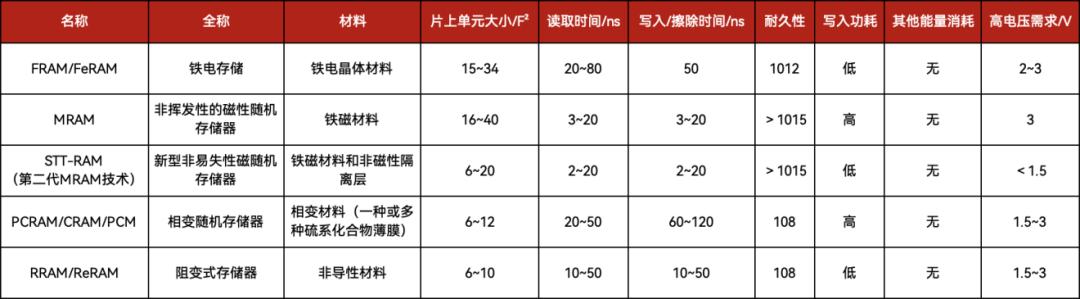 由于嵌入式闪存(eFlash)在28nm触达极限,限制了MCU制程进一步向前发展,厂商纷纷瞄准了新型存储,包括磁存储器(MRAM/STT-MRAM/SOT-MRAM)、相变存储器(PCM/PCRAM)、阻变存储器(RRAM/ReRAM)和铁电存储器(FRAM/FeRAM)。