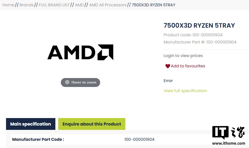 IT之家 10 月 26 日消息,有迹象显示,AMD 正准备进一步扩展其 Zen 4 系列产品线,一款名为 R5 7500X3D 的处理器已出现在英国分销商 West Coast 网站上,ID 为 100-000001904。