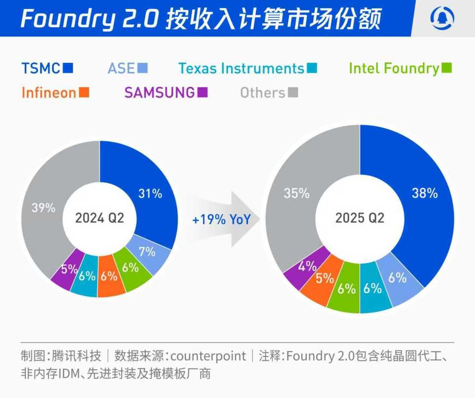 根据Counterpoint的Foundry 2.0营收排行数据,截至2025年Q2,英特尔代工的收入同比微增3%,市场占比持平,维持在6%,而台积电增幅达到44%,份额从31%扩大至38%。