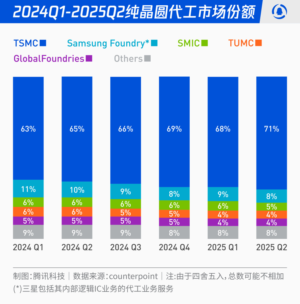 其实更关键的是Counterpoint的另一份纯晶圆代工市场份额的数据(如下图)——其中台积电已经实现连续5个季度的增长,从2024年第一季度的63%,增长至2025年第二季度的71%,而这份数据未将英特尔计算在内。