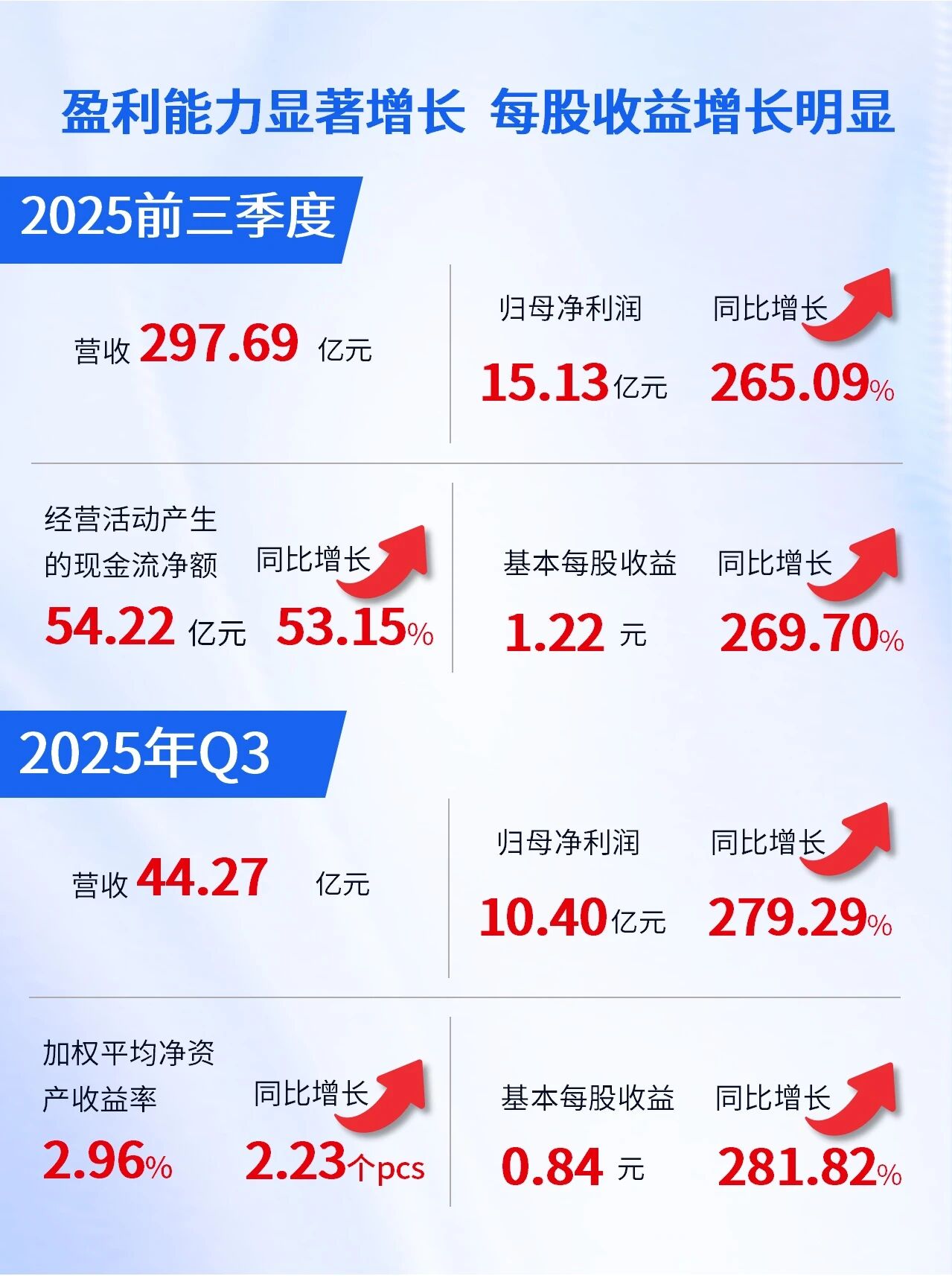 前三季度,公司营收297.69亿元,同比下降44%;归母净利润15.13元,同比大幅增长265%;扣非净利润7.78亿元,同比增长993.41%。