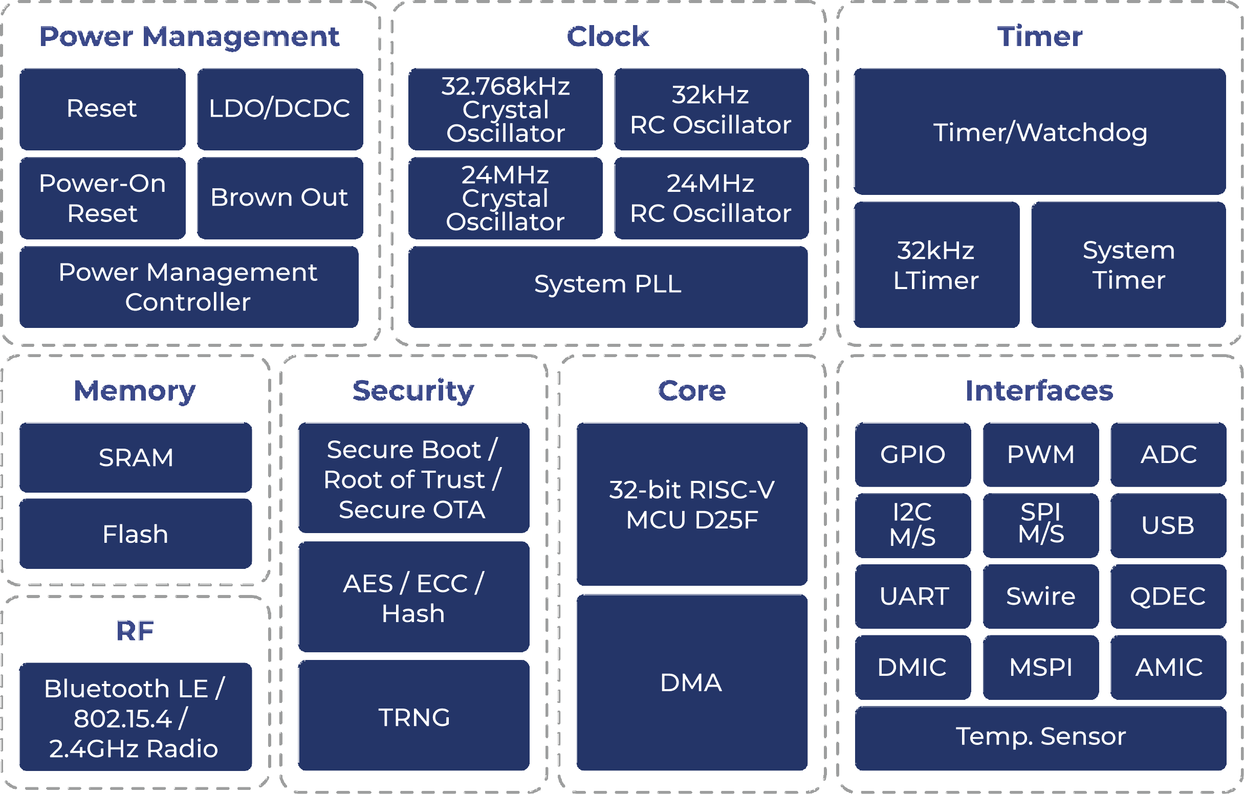 安全方面,芯片内置Root of Trust与Secure Boot机制,搭配AES-128、ECC、Hash、TRNG等加密算法,以及Secure OTA功能,从启动、运行到固件升级全流程保障设备与数据安全,有效抵御恶意攻击。