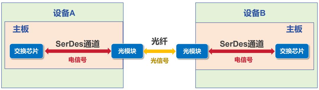 这个模型应该比较容易看懂。两台网络设备,都有各自的光模块。光模块是一个“光电转换器”,可以实现电信号和光信号之间的转换。光模块和光模块之间是光纤,传输光信号。
