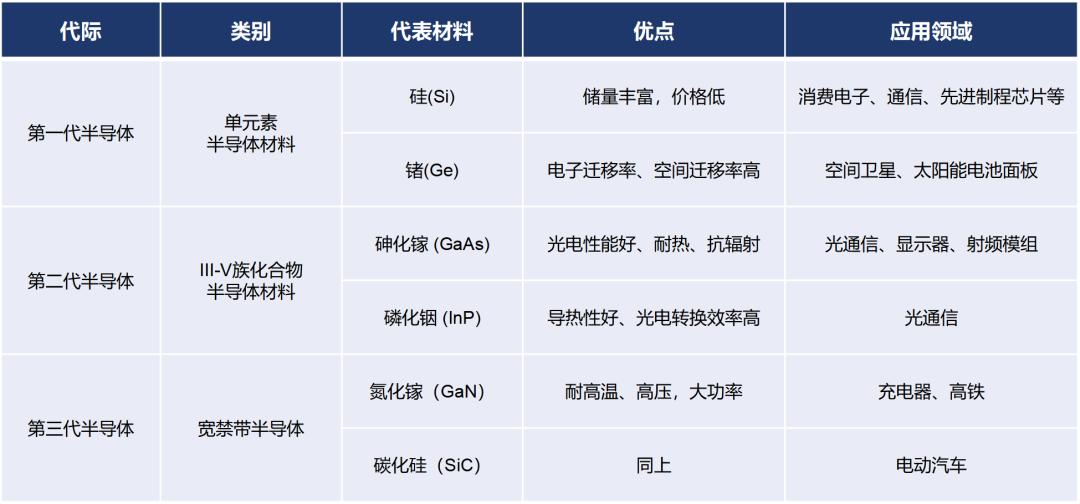 这里解释一下。 半导体材料主要有三类,包括:单元素半导体材料、III-V族化合物半导体材料、宽禁带半导体。