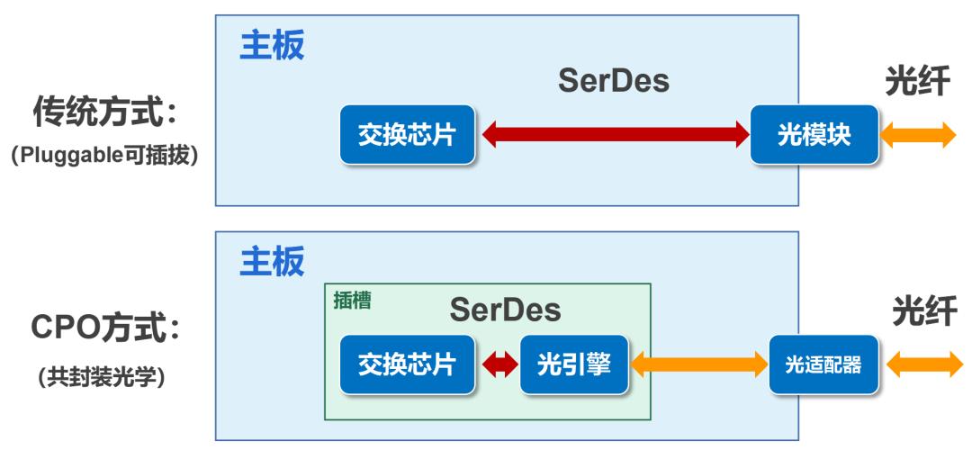 没错!这种将 网络交换芯片和光引擎(光模块)进行“共同封装”的技术,就是现在光通信领域非常火的CPO( Co-packaged optics, 共封装光学 ) 技术。
