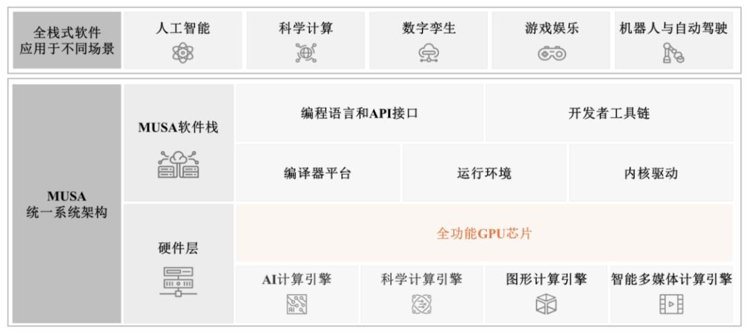 MUSA是一个融合了GPU硬件和软件的全功能GPU计算加速统一系统架构 ,涵盖了统一的芯片架构、指令集、编程模型、软件运行库和驱动程序框架。