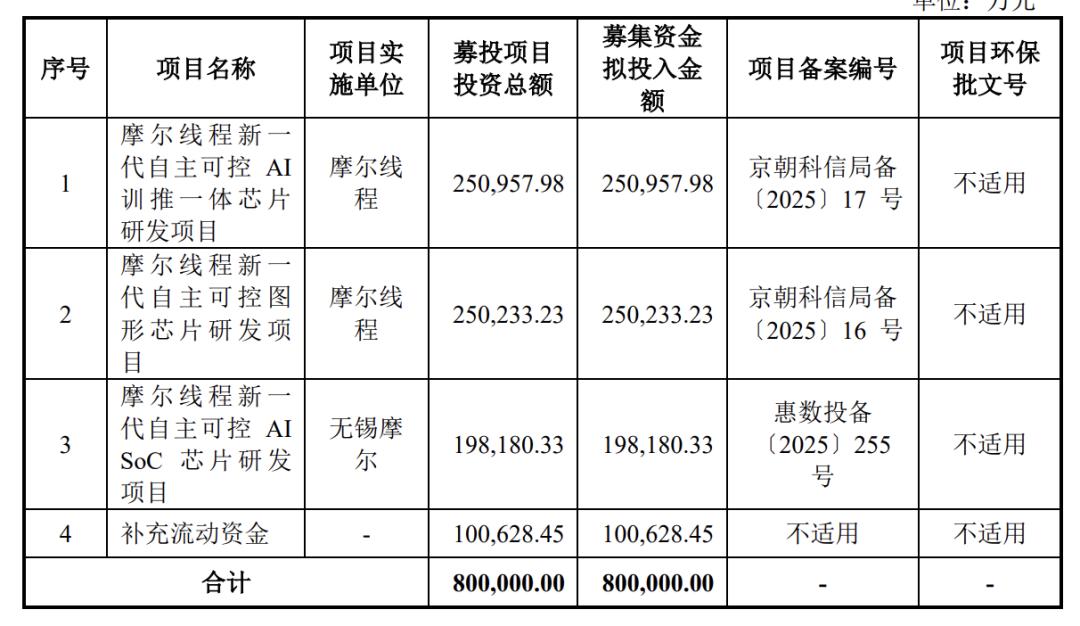其中25.09亿元用于摩尔线程新一代自主可控AI训推一体芯片研发项目,25.02亿元用于摩尔线程新一代自主可控图形芯片研发项目,19.81亿元用于摩尔线程新一代自主可控AISoC芯片研发项目.