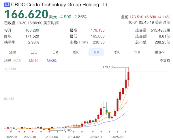 C114讯 10月31日消息(南山)随着人工智能时代到来,光模块作为核心算力支撑硬件,取得了爆发式增长,并收获了资本市场的密切关注。光模块产业链的重要企业Credo,自登陆纳斯达克市场以来,过去几年股价涨幅超过20倍。