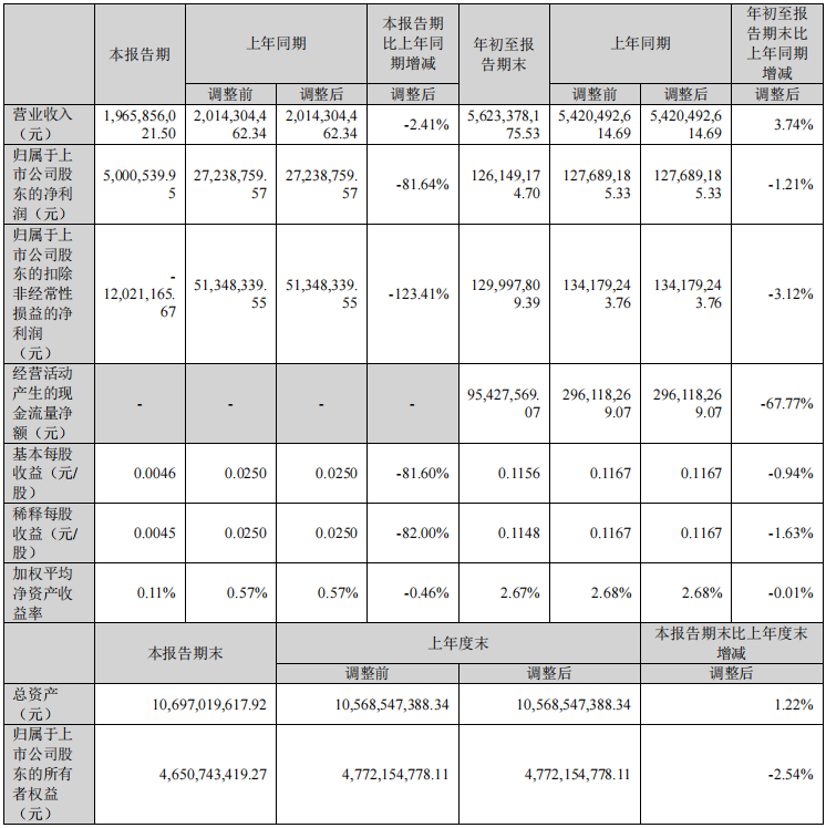从年初至报告期末(2025年1-9月,追溯调整后),公司经营相对平稳。累计营业收入56.23亿元,较上年同期调整后的54.2亿元增长3.74%,营收规模保持稳定;累计归属于上市公司股东的净利润1.26亿元,较上年同期调整后的1.28亿元下降1.21%;累计归属于上市公司股东的扣除非经常性损益的净利润1.3亿元,较上年同期调整后的1.34亿元下降3.12%;基本每股收益0.1156元/股,同比下降0.94%;稀释每股收益0.1148元/股,同比下降1.63%;加权平均净资产收益率2.67%,较上年同期减少0.01个百分点,盈利水平基本持平。