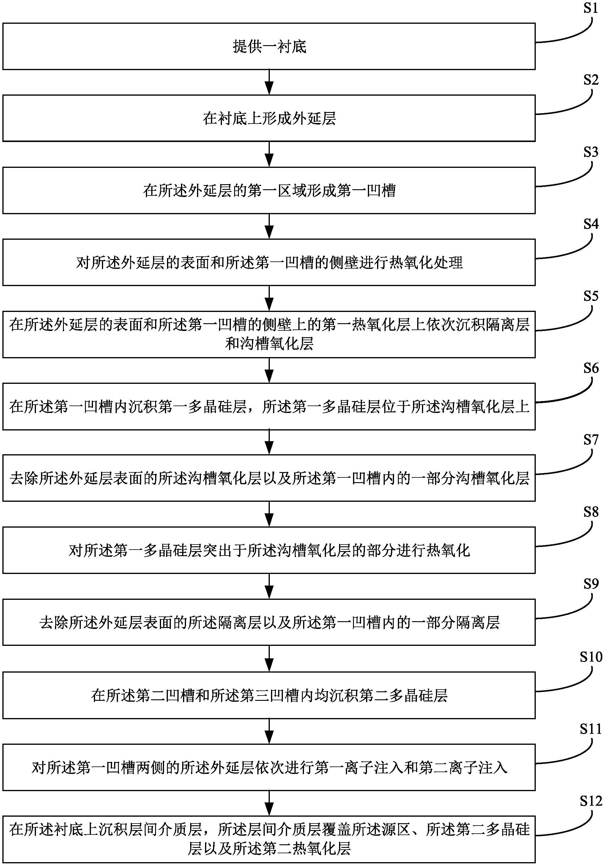 本发明提供了SGT MOS管的器件结构制备方法,该方法包括:在外延层的表面和外延层的第一凹槽侧壁上依次形成第一热氧化层、隔离层和沟槽氧化层,在满足沟槽侧壁氧化层的厚度要求的基础上,对第一热氧化层的厚度进行减薄,以减少对外延层的消耗,从而提高SGT管的耐压性能。在沟槽氧化层构成的凹槽内沉积第一多晶硅层,并去除第一凹槽内的部分沟槽氧化层,由于设置了所述隔离层,因此第一多晶硅层突出部分表面的栅间氧化层可按需求厚度进行生成,从而降低了SGT管的栅源电容。沉积第二多晶硅层并对第一凹槽两侧的外延层进行第一离子注入和第二离子注入。在衬底上沉积层间介质层,完成器件结构的制备。