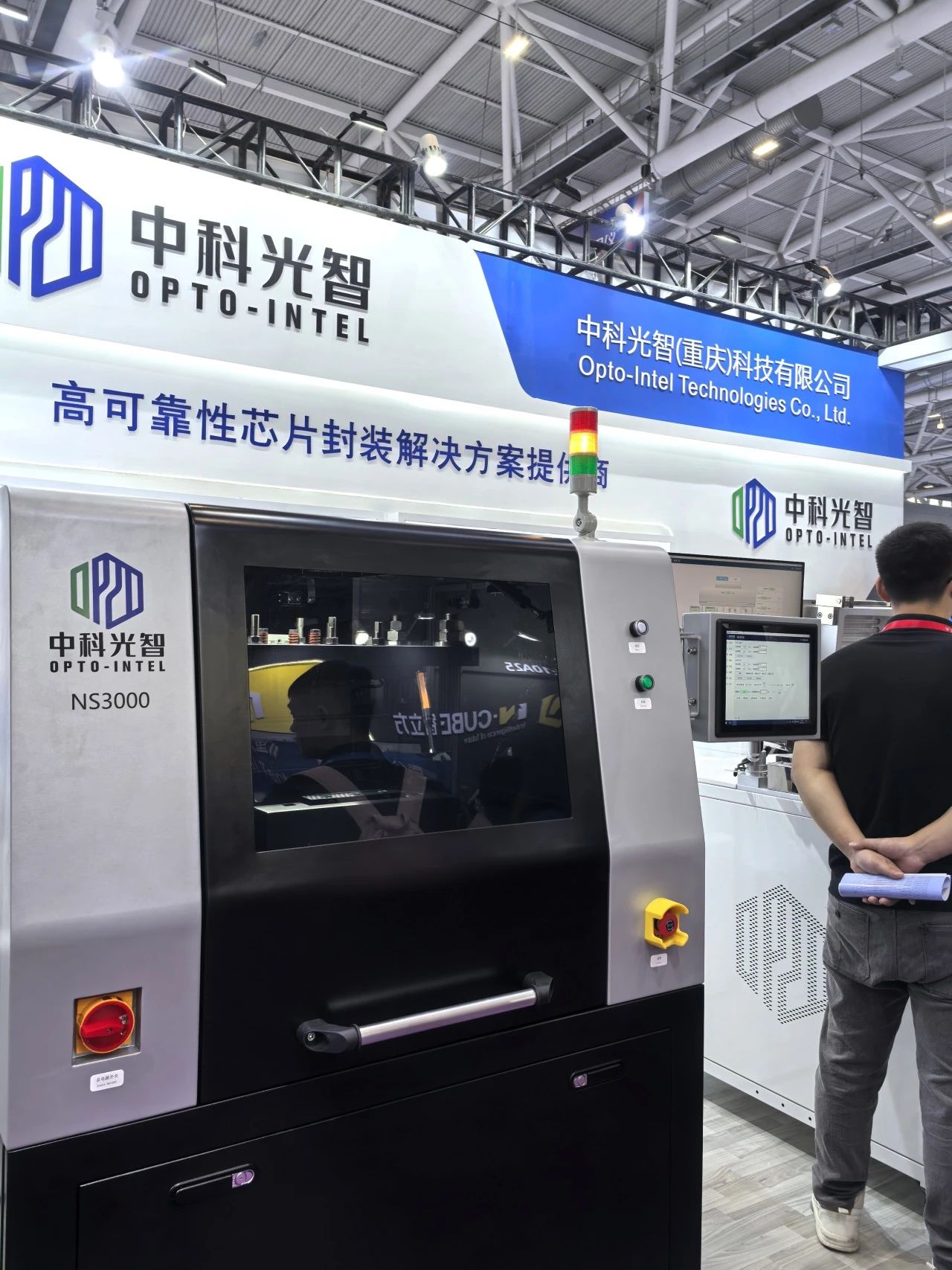 本次光博会的重头戏——中科光智自主研发制造的全自动高精度贴片机。这款设备凭借其精度高、效率快、操作便捷等特点,成为高可靠性碳化硅芯片封装的关键工具。