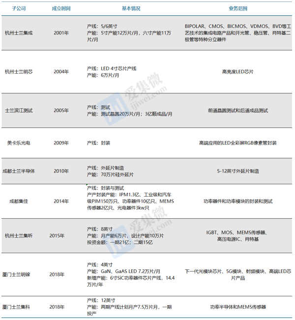 1、士兰微搭建特色工艺的芯片制造平台,产线覆盖 4/5/6/8/12英寸,在功率器件、功率模块、MEMS传感器、高端LED彩屏像素管和光电器件的封装领域,建立了较为完善的IDM经营模式。