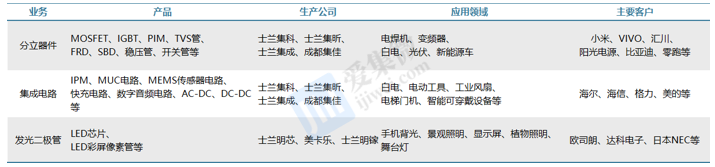 士兰微主要有三大类产品,分别是分立器件、集成电路和发光二极管等产品。公司在功率分立器件、集成电路、MEMS传感器等方面拥有国内领先的核心技术,并且在IGBT、MOSFET等产品性能上达到了国内领先水平。