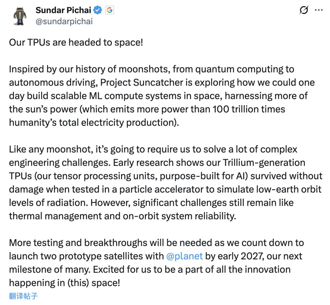 CEO劈柴哥表示要把TPU也发射上去,最早的两颗卫星2027初启程。