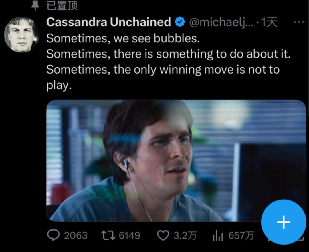 更引人深思的是《大空头》原型Michael Burry的最新发声。这位传奇基金经理在社交媒体上引用了1983年电影《战争游戏》中的经典台词:“有时,我们看到泡沫。有时,我们尚可有所作为。有时,唯一获胜的方式就是不玩。”