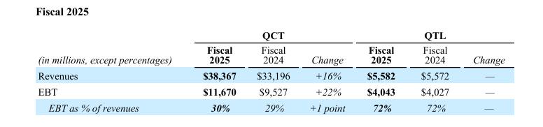 高通2025财年来自设备和服务的总营收为378.69亿美元,而上年为327.91亿美元;来自授权业务的营收为64.15亿美元,而上年同期为61.71亿美元。