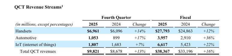 高通QCT(芯片)部门第四财季营收为98.21亿美元,与上年同期的86.78亿美元相比增长13%。