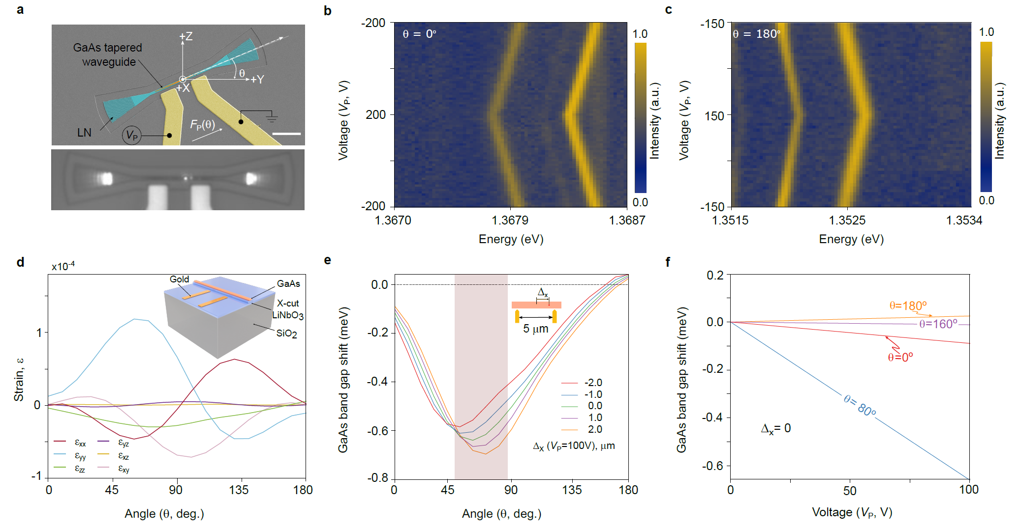 图2:(a)不同取向的量子点砷化镓-铌酸锂混合集成波导,单光子信号可通过波导顶部或光栅耦合器输出。(b,c)不同波导取向的片上应力调控。(d)取向角度相关应力张量分布的数值仿真。(e,f)波导取向相关的量子点能带调谐数值仿真。