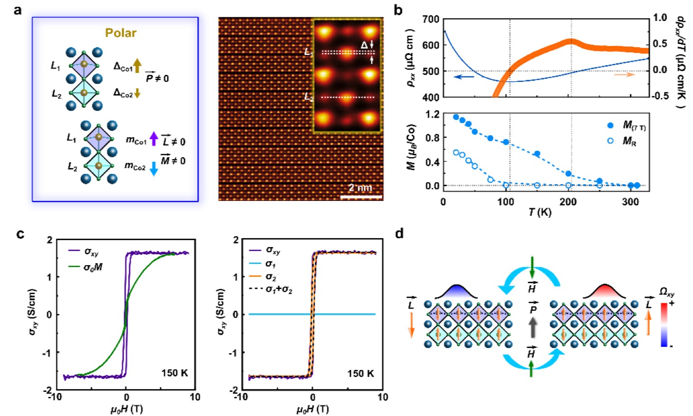 图a:Sr3Co2O7中反铁磁极化结构形成的示意图(左)以及扫描透射电镜表征下的极化结构(右);b:电阻率与磁矩随温度变化趋势;c:非磁依赖的反常霍尔效应;d:极性与反铁磁耦合下奈尔矢量翻转