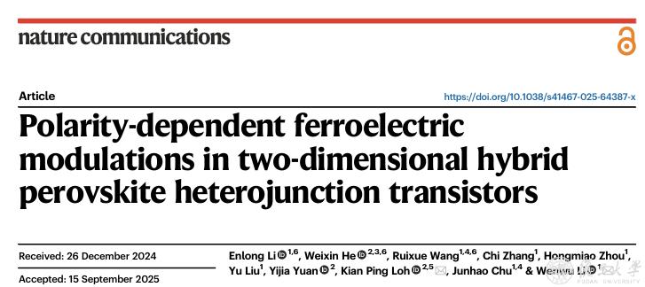 该成果以“Polarity-dependent ferroelectric modulations in two-dimensional hybrid perovskite heterojunction transistors”为题,发表于Nature Communications。