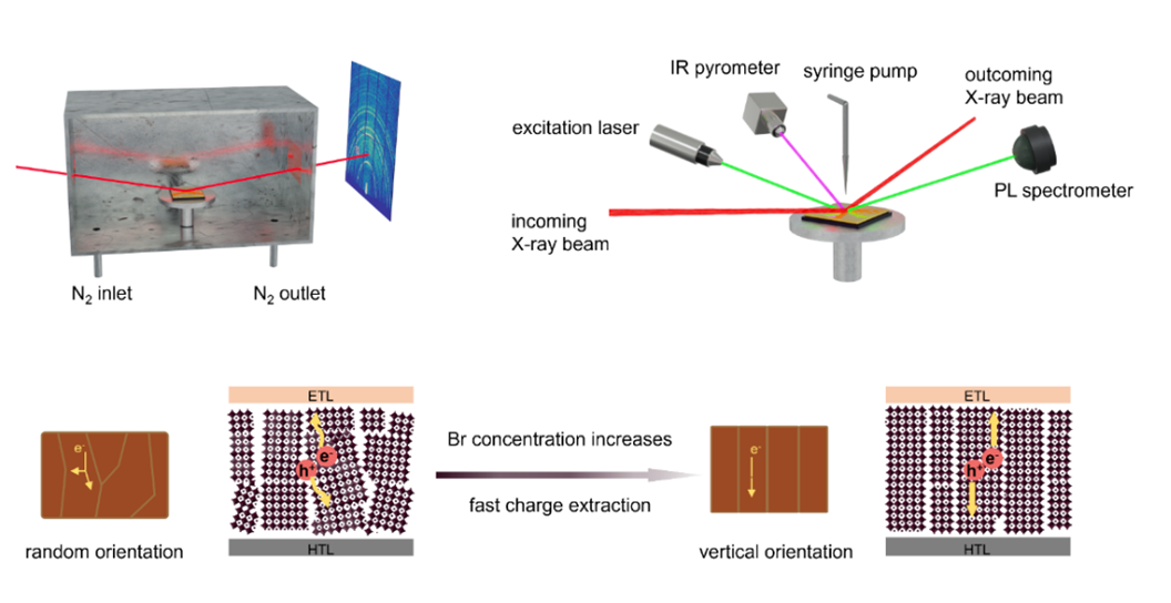 为解决这一困境,研究团队采用同步辐射多模式原位表征,将掠入射广角X射线散射(GIWAXS)与荧光光谱(PL)联用,实现了对 MAPbI3-xBrx 钙钛矿体系结晶过程的实时、多维解析,揭示了两条截然不同的结晶路径:其一为过渡中间相辅助生长模式(富碘组分),其二为自上而下生长模式(富溴组分)。在较高溴含量下,后者使薄膜表面层充当“结构模板”,诱导形成排列规整、以垂直取向为主的晶体择优取向。进一步发现,在热退火过程中,富溴宽带隙钙钛矿薄膜经历溶解–再结晶过程,并伴随发生卤素均质化,导致薄膜内引入了大量缺陷。