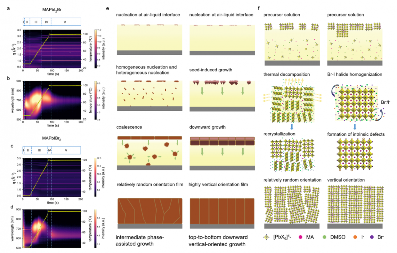 图2. 基于GIWAXS+PL原位表征MAPb(I1-xBrx)3钙钛矿薄膜的结晶动力学:(a-d)GIWAXS+PL数据,(e,f)结晶生长模式示意图。