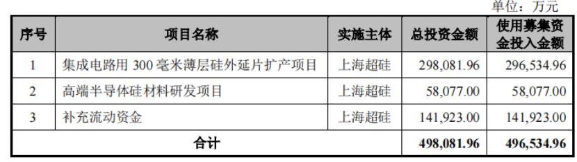 上海超硅本次拟募集资金49.65亿元,将投资于“集成电路用300毫米薄层硅外延片扩产项目”“高端半导体硅材料研发项目”和“补充流动资金”。