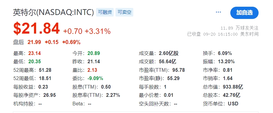 受该消息影响,英特尔股价盘中一度暴涨超过9%,收盘上涨3.3%,而高通下跌2.9%。高通公司的市值为1881 亿美元,约为英特尔的两倍。