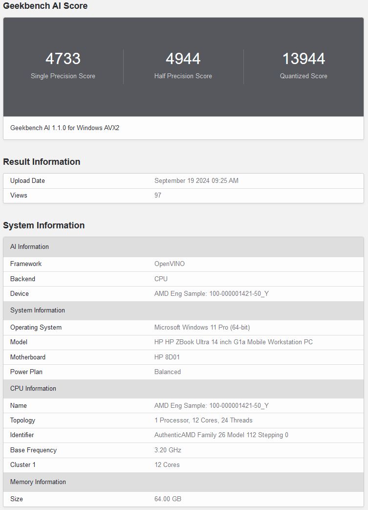 根据跑分库信息,该处理器的 32 位单精度(Single Precision)、16 位半精度(Half Precision)以及 8 位量化精度(Quantized)得分分别为 4733 分、4944 分和 13944 分。