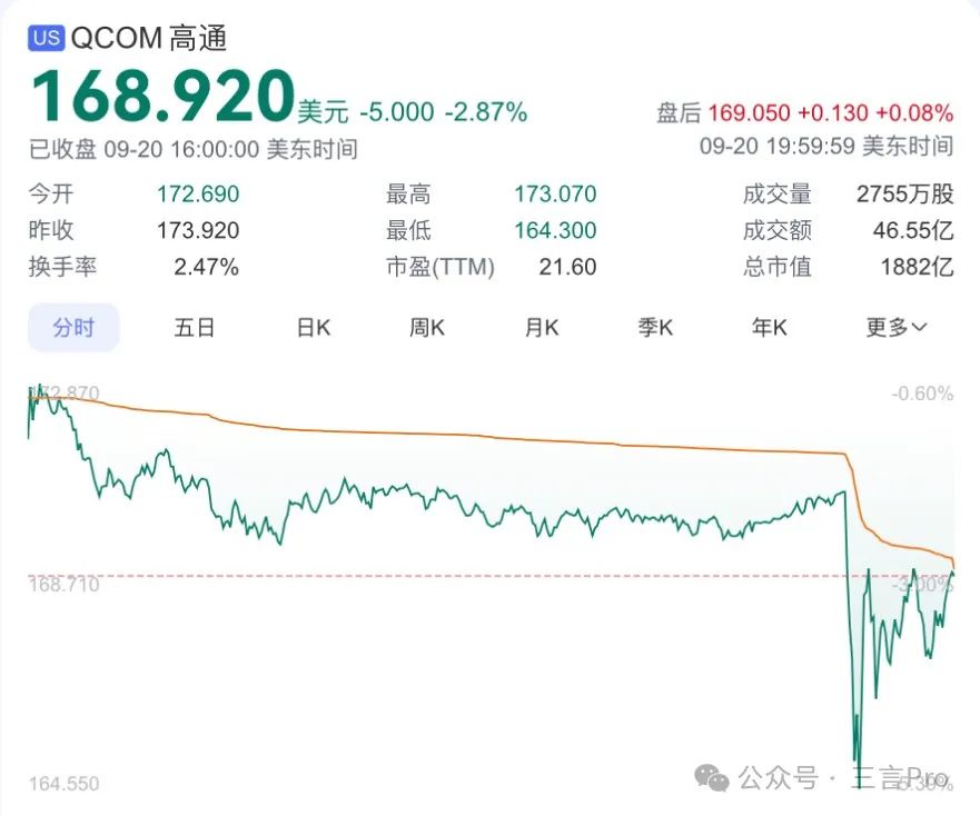 截至收盘,高通股价报168.92美元,下跌2.87%,总市值1882亿美元;英特尔股价报21.84美元,上涨3.31%,总市值933.88亿美元。