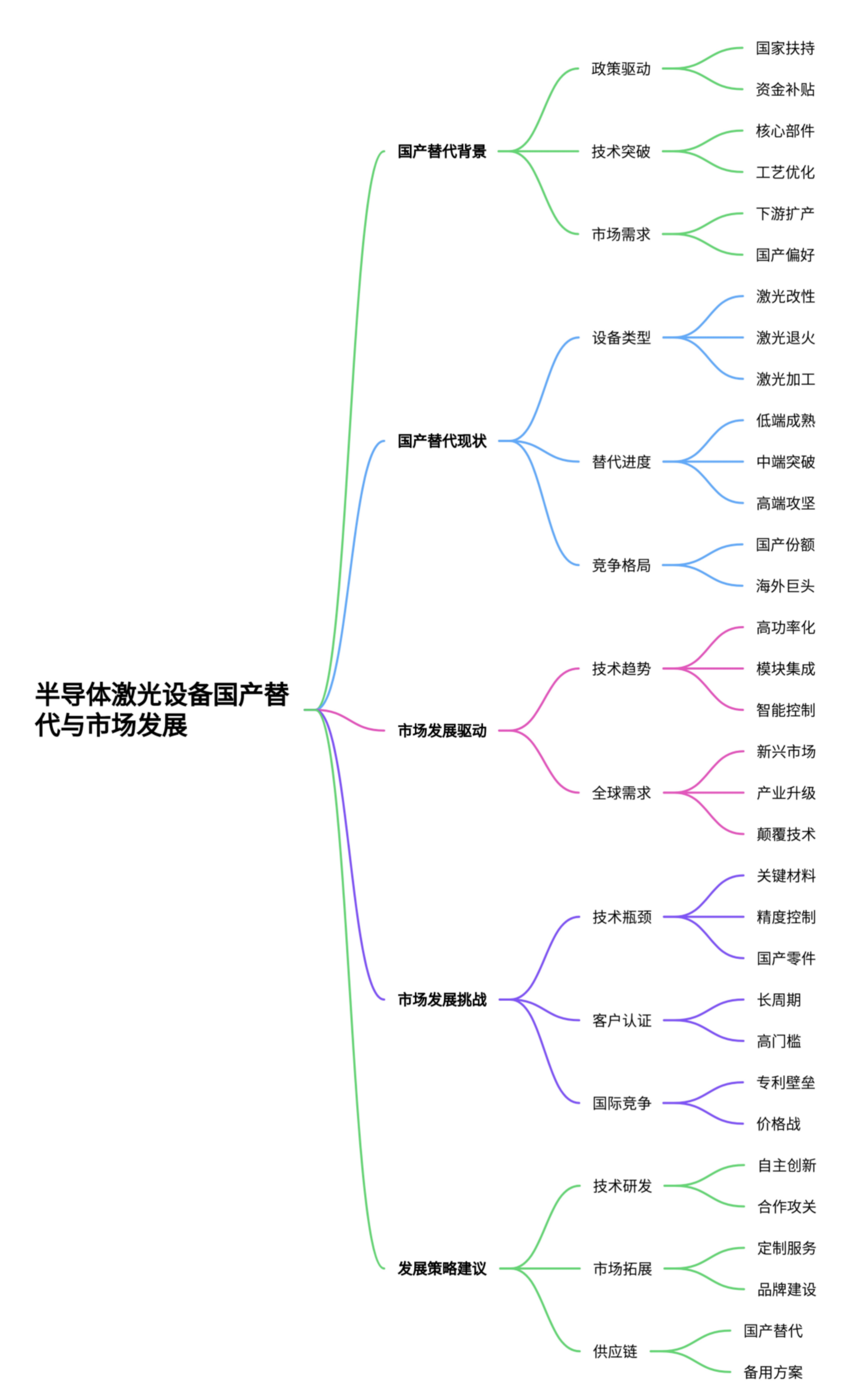 激光凭借高能量密度、非接触加工以及对材料适应性强等优势,被广泛应用于消费电子、汽车制造、新能源和半导体产业链等领域。随着半导体制造和封装工艺的发展,激光设备在半导体行业中发挥越来越重要的作用。近年来,随着下游行业对轻量化、精密化和智能化需求的不断增加,半导体激光加工设备正加快迭代升级。从传统的二极管泵浦到光纤耦合、超快激光技术,设备在功率稳定性、加工精度和能耗表现上均显著提升。与此同时,国产厂商也在技术突破和成本控制方面不断追赶,逐步缩小与国际领先企业的差距。可以预见,未来半导体激光设备将不仅是单一制造环节的工具,而是成为驱动制造业转型升级的重要引擎。在新兴产业快速发展的背景下,其市场需求有望持续扩大,带动产业链迎来新的增长机遇。