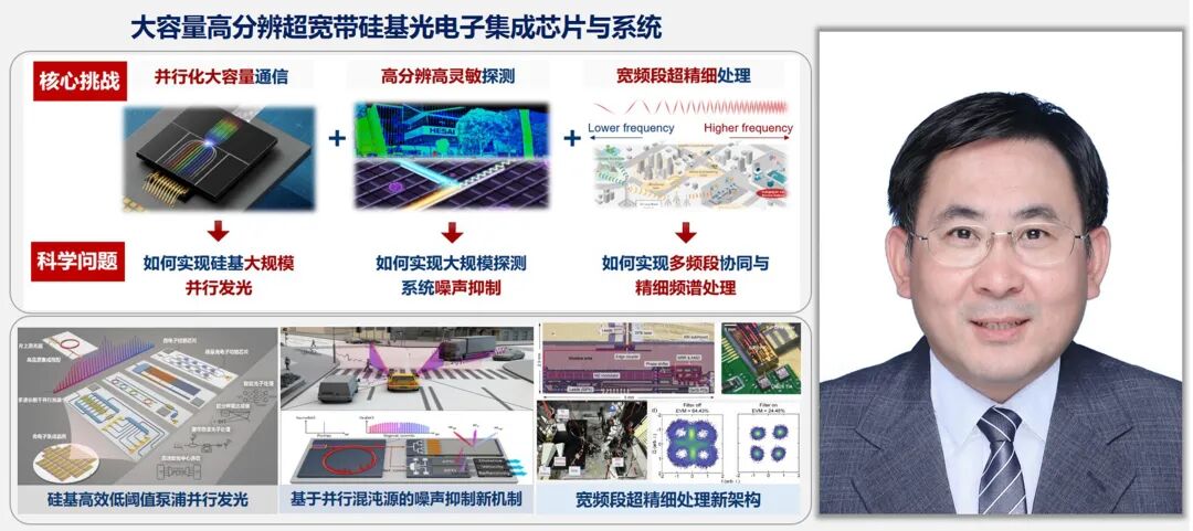 硅基光电子集成芯片凭借低成本、高集成度及CMOS工艺兼容性优势,成为光电子领域的研究热点。然而,大容量通信、高灵敏探测和宽频段精细处理等核心技术的瓶颈制约了其进一步发展。为此,研究团队围绕上述关键科学问题展开攻关,取得系列突破性进展,主要创新成果包括: