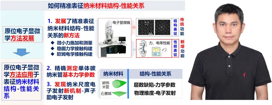 材料制备、结构、性质、效能四者之间的构效关系是材料科学的核心问题,其中结构与性能关系是关键。如何精准表征纳米材料的结构-性能关系是低维纳米材料研究的一个关键问题。传统表征材料结构-性能关系的方法一般基于不同的样品、不同的设备分别表征结构和性能,其前提是不同样品在不同设备环境下结构和性能相同。但是,纳米材料性能对结构、环境敏感,且不同个体之间结构和性能经常不同,不具备上述前提,因此传统方法难以精准表征纳米材料的结构-性能关系。为此,本项目发展了一系列原位电子显微学方法,解决了如何在电子显微镜中精确表征单体纳米材料的力学、电学等物理性能的问题,实现了在同一设备环境下、针对同一单体纳米材料、同时表征结构和性能,提供了精准表征纳米材料结构-性能关系的新方法。应用上述方法进一步揭示了碳纳米管、石墨烯等重要纳米材料的结构-性能关系,包括:精确测定了单体碳纳米管的多个基本力学参数,建立了力学参数与结构的关系;在低维碳纳米材料中发现了声子助电子发射新机制,建立了物理维度与热电子发射的关系等。研究成果为相关纳米材料在纳米电子器件等领域的应用提供了重要结构-性能关系的支撑。共发表SCI论文80余篇,5 篇代表作共被SCI 他引600余次,2篇博士学位论文被评为全国优秀博士学位论文。