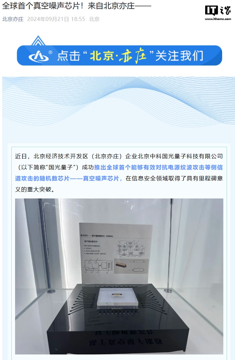IT之家 9 月 22 日消息,据“北京亦庄”公众号消息,近日,北京中科国光量子科技有限公司(以下简称“国光量子”)成功推出全球首个能够有效对抗电源纹波攻击等侧信道攻击的随机数芯片 —— 真空噪声芯片。