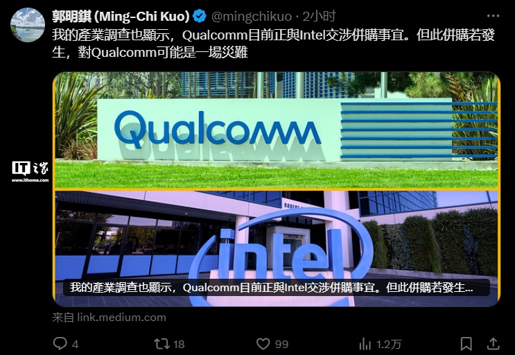 IT之家 9 月 22 日消息,天风国际分析师郭明錤今日在社交平台 X 就高通寻求收购英特尔的传言发表观点称:“我的行业调查还表明,高通目前正在与英特尔进行收购谈判。然而,如果这次收购发生,对高通来说可能是一场灾难。”