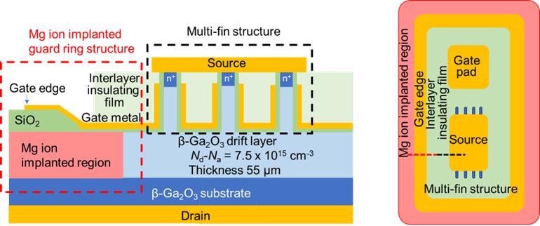β-Ga₂O₃MOSFET 结构示意图(a)剖面图 (b)俯视图(图源:NCT)