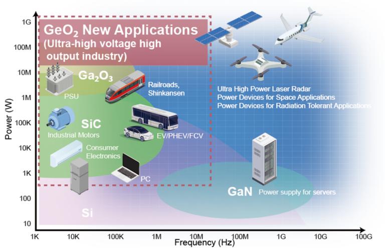 这一突破,再次将超宽禁带(UWBG)氧化物材料体系推向前台。随着电动汽车(EV)的普及、AI 数据中心的能耗增长、减碳与节能需求的增强,以及车载功率模块小型化趋势的到来,超宽禁带半导体的商业化正受到高度期待。而氧化物,如GeO2和Ga₂O₃,正被视为实现更高耐压、更高功率、更高效率的下一代功率半导体器件的重要候选材料。