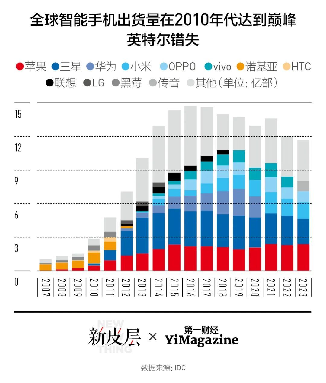 而智能手机市场在2011年就被永久改变了。2009年,苹果的出货量还不到诺基亚的1/3,后者是当年市场份额最高的手机品牌。2010年,苹果发布iPhone 4,2011年它就反超了诺基亚。到了2013年,诺基亚几乎从手机市场消失。英特尔被迫于2016年宣布停止开发Atom系列处理器,退出移动手机、平板电脑领域,将公司重点转向数据中心和代工。