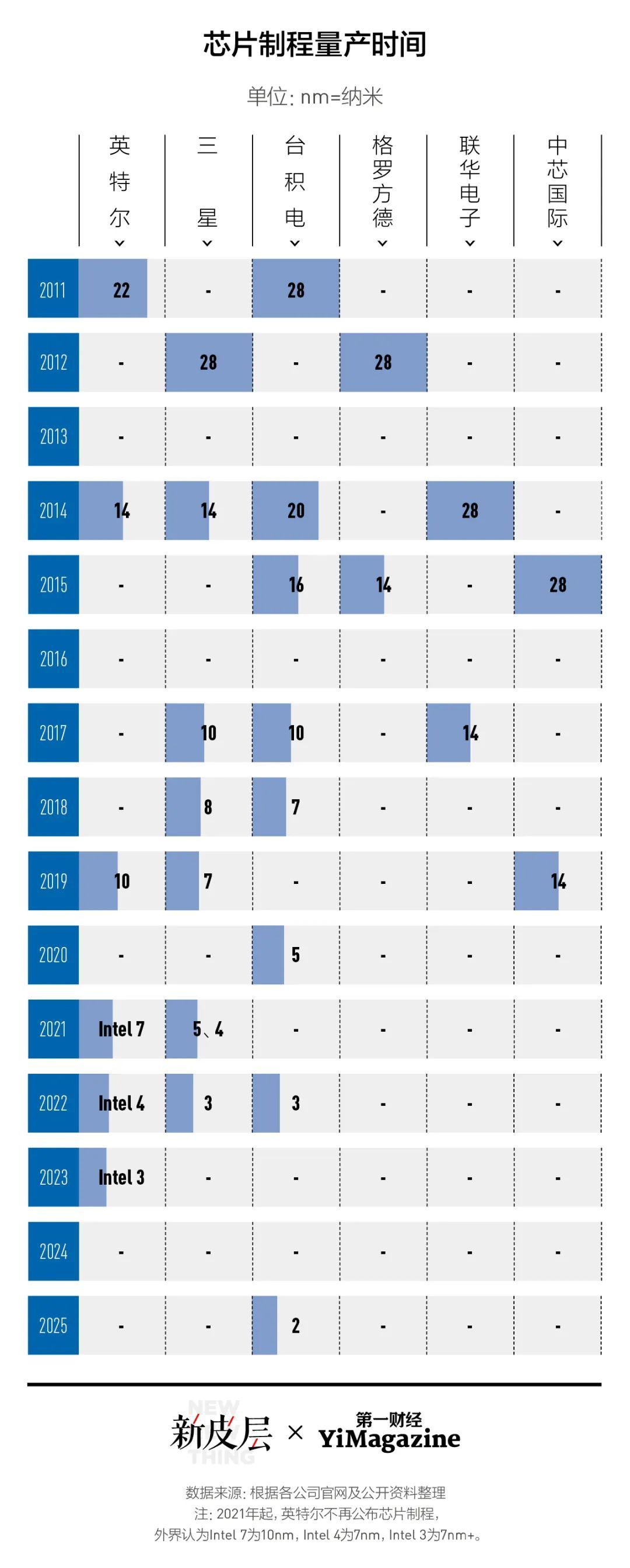 对IDM模式的坚持被认为在多个层面拖累了英特尔。首先是在芯片工艺上。作为摩尔定律的提出者,英特尔从1970年代开始用行动证明这一定律,直到2014年——那一年,它率先推出14nm芯片,当时台积电的最先进工艺还卡在20nm阶段。不过之后英特尔就忽然失速了。原计划2016年量产的10nm芯片迟迟没有兑现,原因是良率问题无法解决。原本落后的三星和台积电反过来率先于2017年攻克了10nm的良率问题,实现量产。而英特尔10nm芯片的良率问题一直拖到2019年下半年才解决。直到现在,英特尔的芯片工艺仍然落后于台积电3代。台积电的2nm芯片已于今年7月开始试生产,英特尔最先进的芯片制程迄今仍停留在7nm,中间隔着5nm和3nm。
