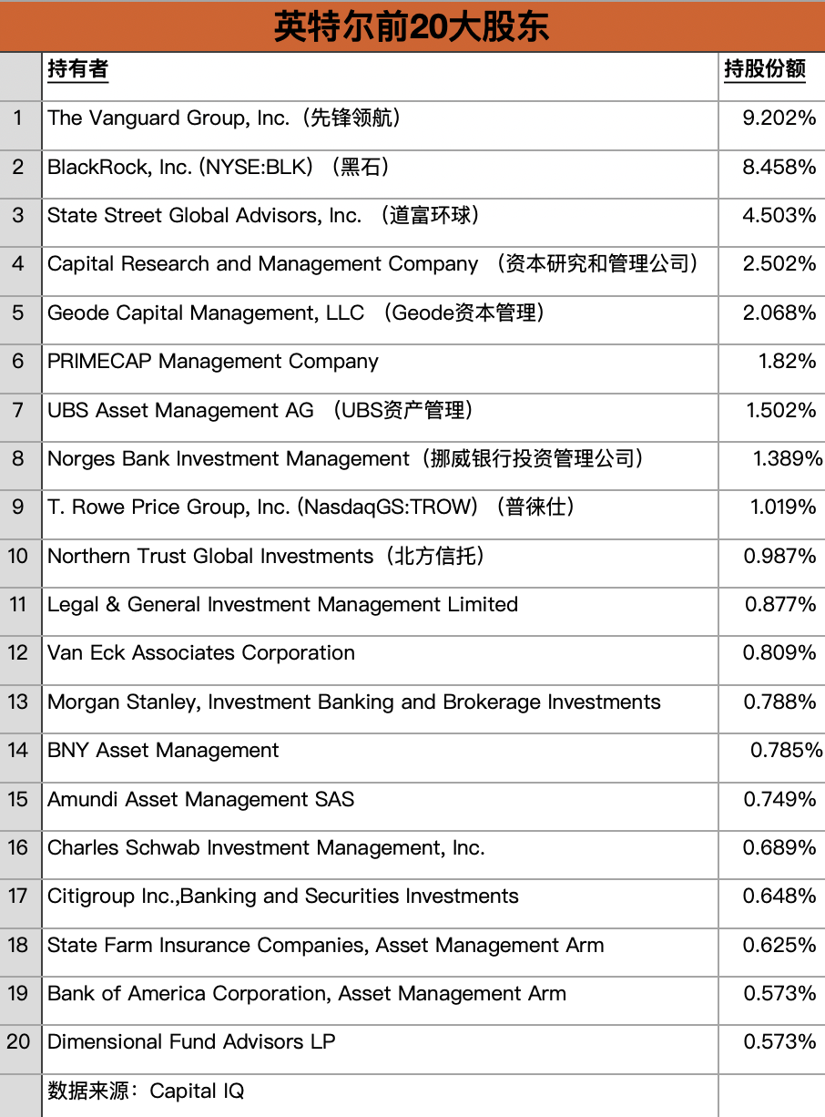 9月21日的消息使得这项收购变得更具现实性。眼下,英特尔的市值并不算高,不到高通的1/2,更不到英伟达的1/30。而且,英特尔的股权相当分散,其最大股东先锋领航仅持有9.2%的股份,前十大股东持股加起来也才超过30%。最重要的,这些股东几乎都是财富管理公司,清一色的财务投资者。