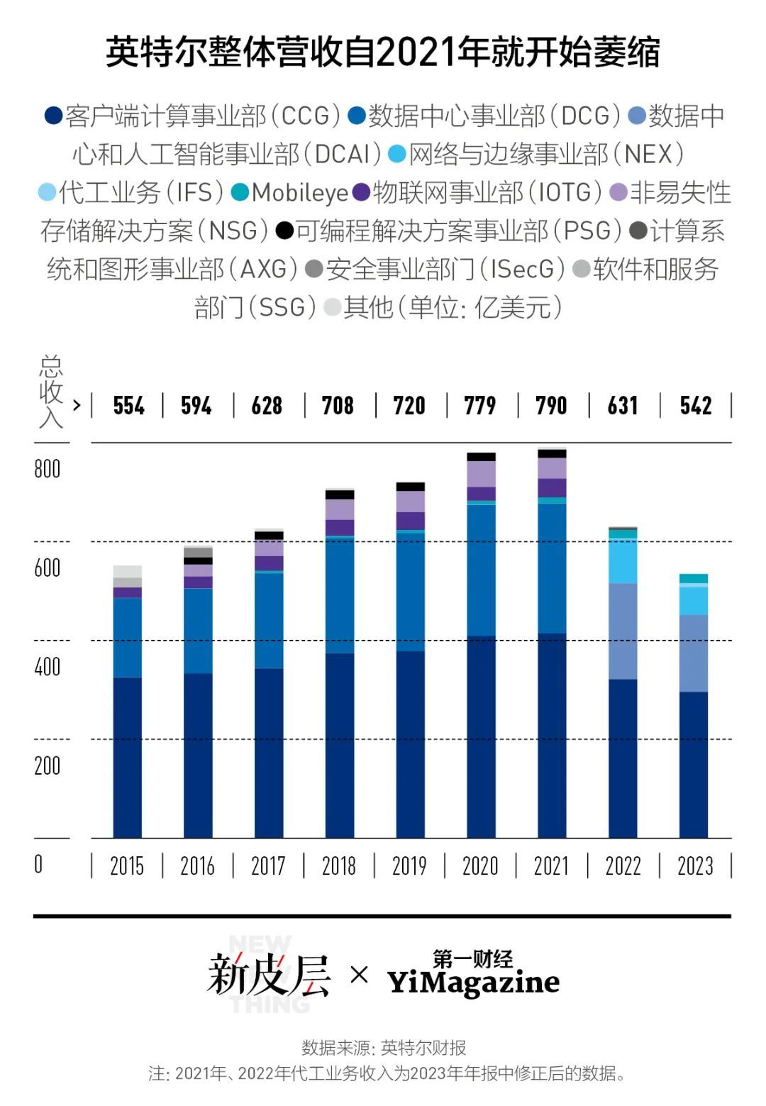 进入2010年代以来,作为英特尔核心业务的CPU的营收就几乎不再增长,尤其是用于个人电脑(即PC)的那部分CPU。2015年,英特尔客户端计算事业部营收322亿美元,到了2021年,这部分收入只增长至405亿美元,年平均增长率不到10%,有的年份仅有0.3%的增长,2022年和2023年两年则连续下降。2023年,英特尔在PC市场销售CPU获得的收入只剩293亿美元,比2015年还少了11%。
