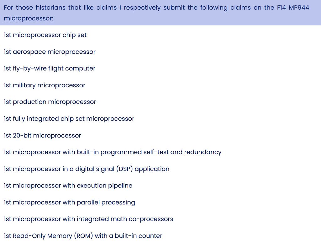 在霍尔特1971年被拒、1985年再次被拒,直至1998年才得以解密的论文中,这位架构师解释道,他们将20位、流水线式、并行多微处理器与最先进的MOS技术相结合,从而创造出了MP944。该微处理器运行频率为375kHz,每秒能够执行9375条指令。这被视为满足所需能力的最为有效的解决方案。