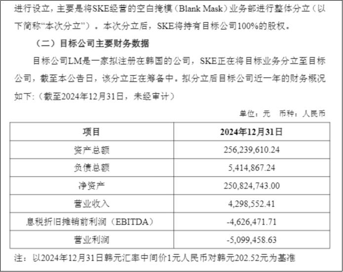 目前,SKE正在将空白掩模业务分立至Lumina Mask株式会社(暂定名,简称“LM”)。分立后,SKE将持有LM100%股权。值得注意的是,LM总资产2.56亿元,净资产2.51亿元;2024年亏损510万元。与之相比,聚和材料给出了3.5亿元交易价格,溢价高达39.44%。