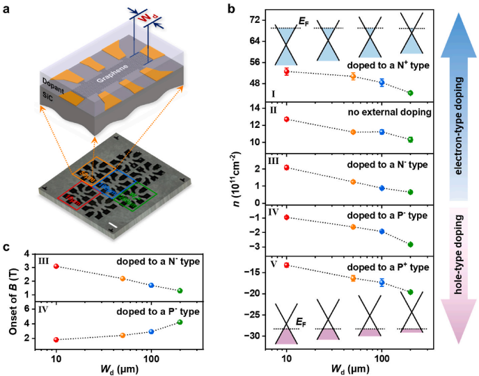 团队通过制备不同沟道宽度的石墨烯霍尔器件,并旋涂掺杂剂,精确调控载流子类型和密度。测量结果发现,石墨烯霍尔器件中的载流子密度随沟道宽度变化呈现规律性差异,即在电子掺杂条件下,载流子密度随沟道宽度增加而降低;在空穴掺杂条件下,则相反。这一现象在沟道宽度≤400μm时尤为明显,直接影响了器件进入量子化霍尔平台所需的磁场阈值。